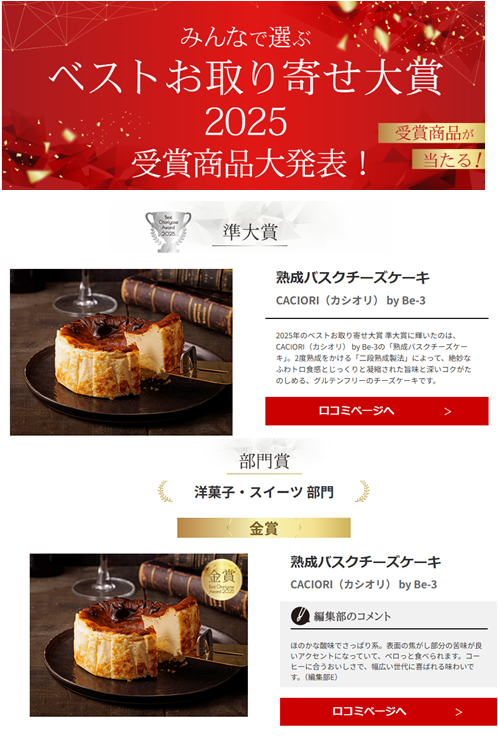 ベストお取り寄せ大賞で熟成バスクチーズケーキが2つ受賞をいたしました。